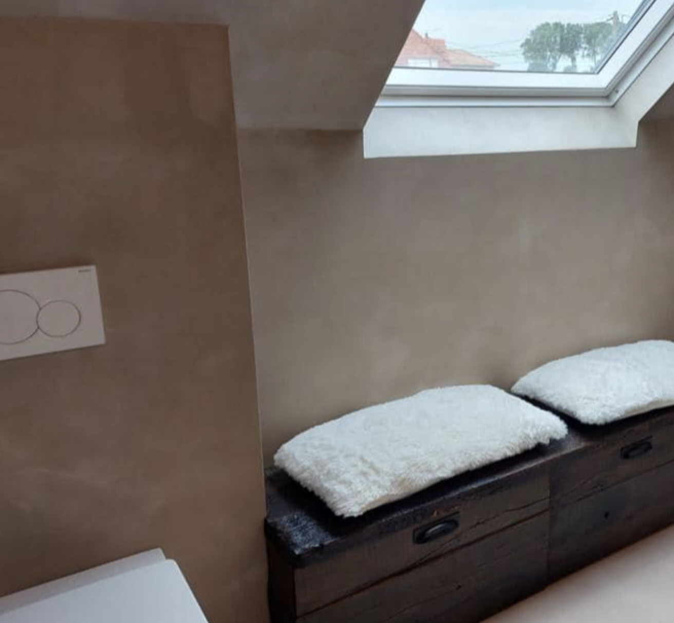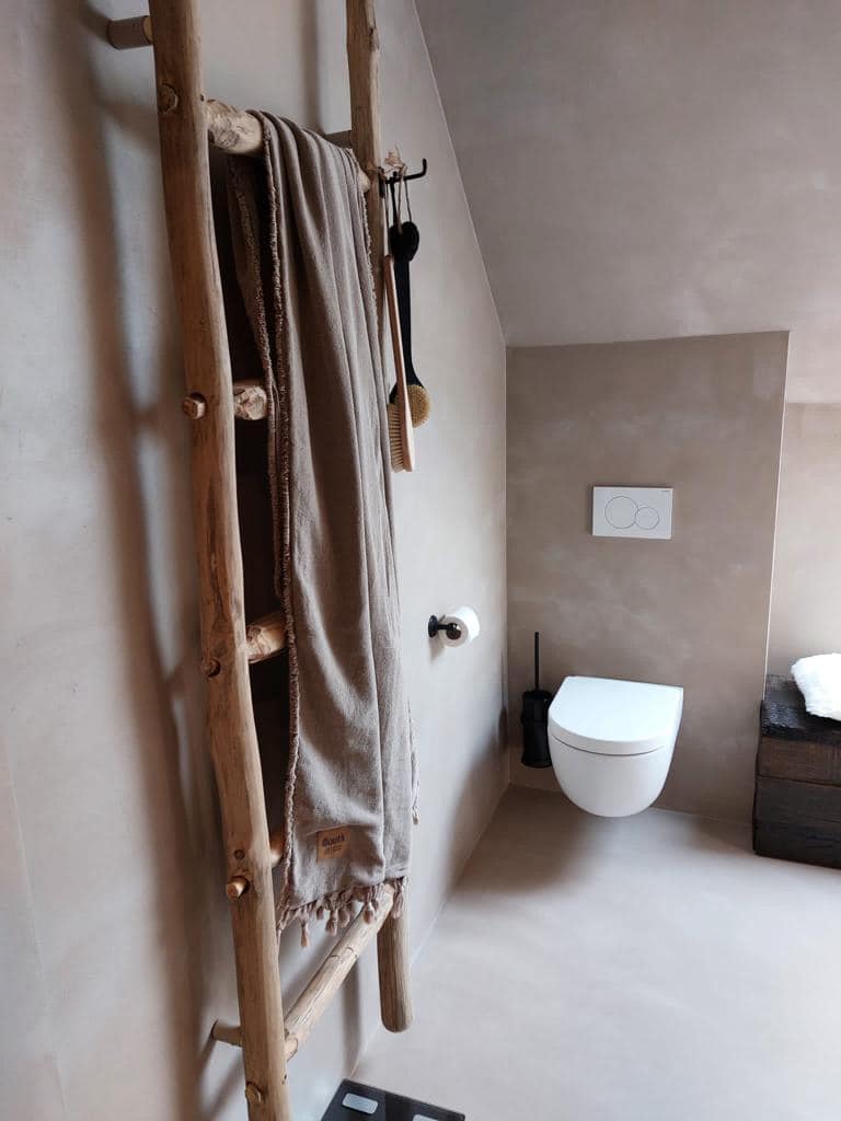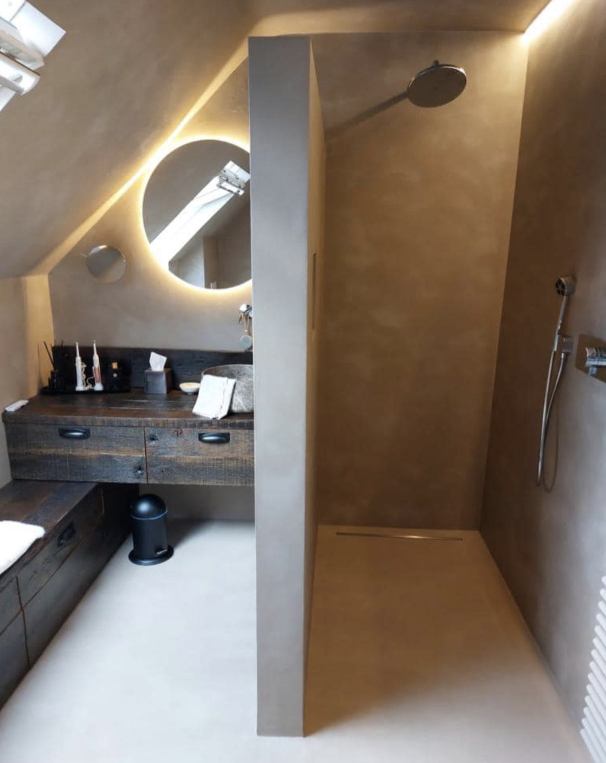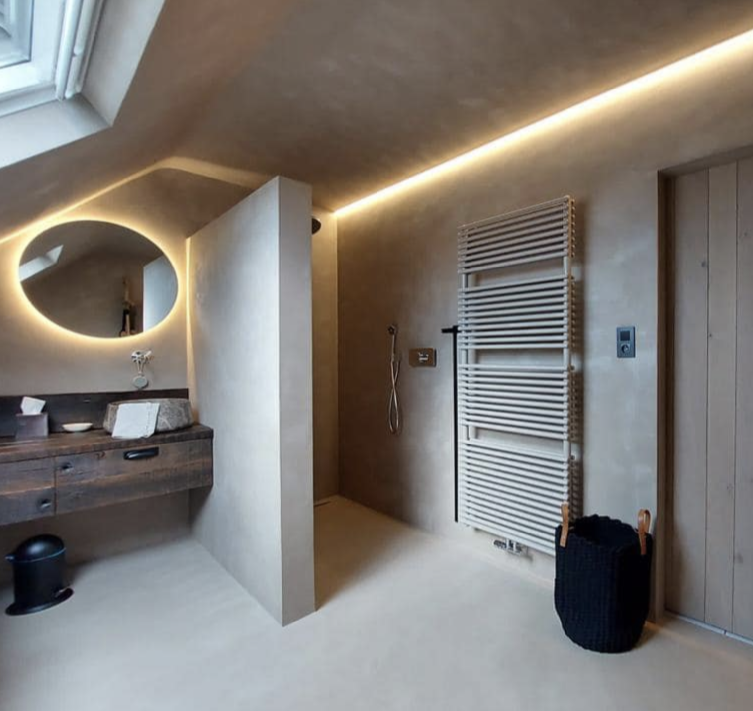 Moderne badkamer renovatie met warme, minimalistische uitstraling Deze badkamer renovatie combineert strak design met warme materialen voor een luxueuze en rustige uitstraling. Door het gebruik van zachte aardetinten, naadloze wanden en subtiele LED-verlichting ontstaat een moderne en tijdloze badkamer.