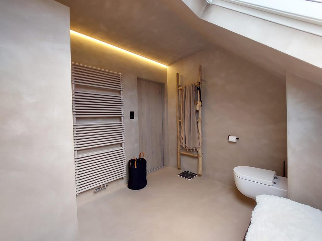 Moderne badkamer renovatie met warme, minimalistische uitstraling Deze badkamer renovatie combineert strak design met warme materialen voor een luxueuze en rustige uitstraling. Door het gebruik van zachte aardetinten, naadloze wanden en subtiele LED-verlichting ontstaat een moderne en tijdloze badkamer.